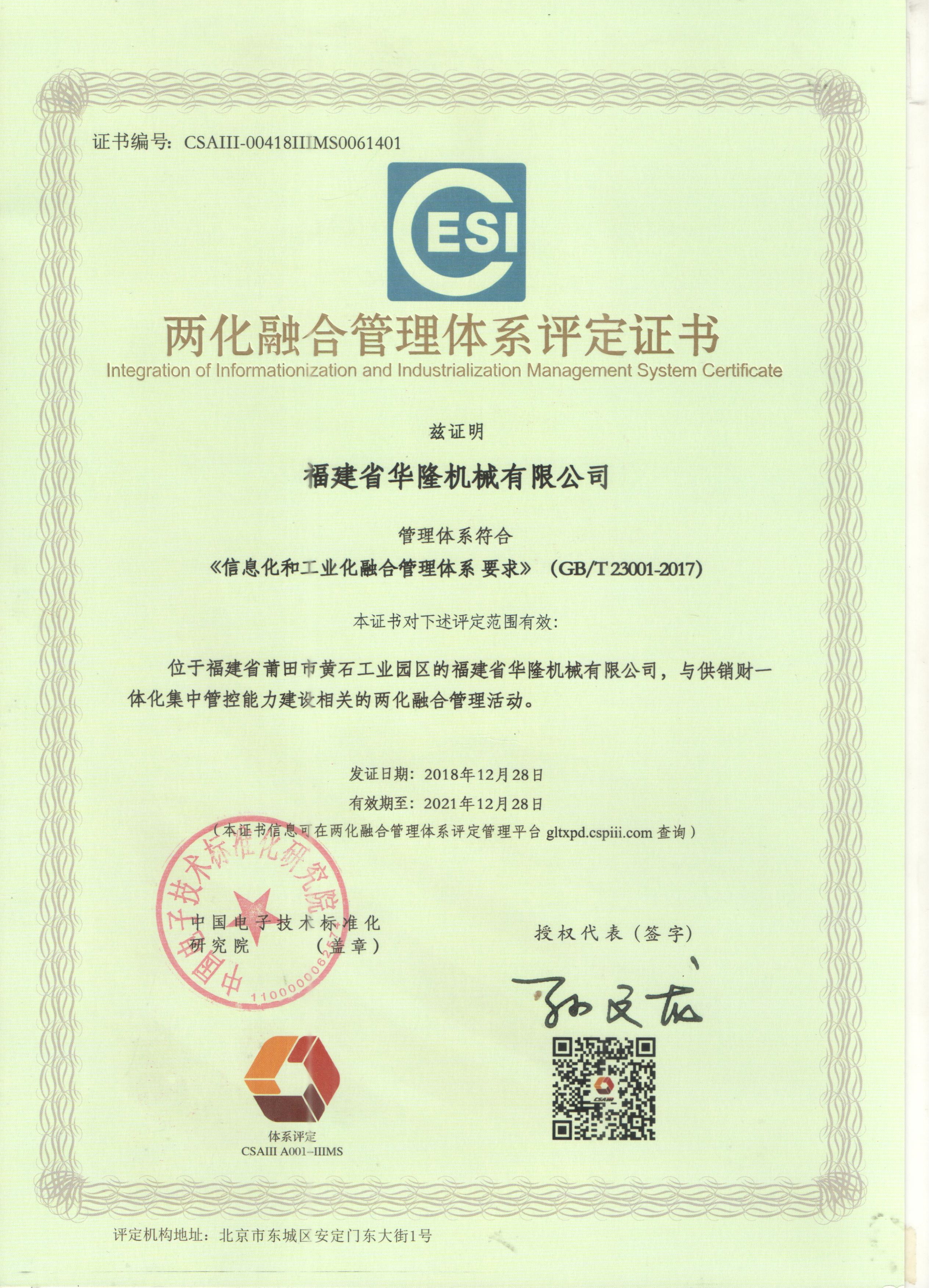 两化融会系统评定证书